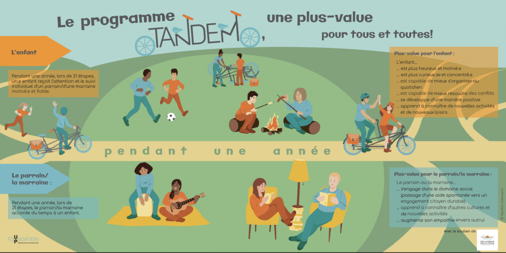 Le programme de mentorat TANDEM est une aventure humaine et solidaire qui jumelle un·e enfant avec une marraine/un parrain bénévole. Pendant 12 mois et au cours de 21 rencontres, le tandem ainsi formé explore des activités extrascolaires de toutes sortes. En partageant ces moments de qualité, l’enfant et sa marraine/son parrain découvrent de nouvelles perspectives, cultures et modes de vie.